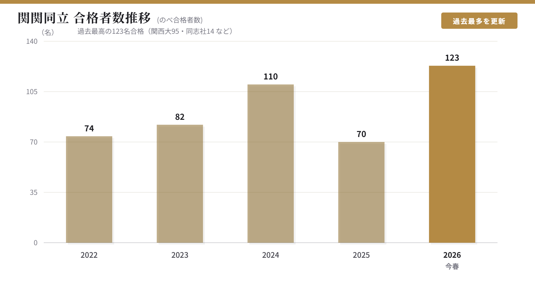 関関同立は123名合格と、2年前の過去最高記録を10名以上上回る大きな成果が出ました。特に文理特進Ⅱ類コースで、同志社大・関西大に一般入試で多数の合格が出るなど、大健闘しました。さらに関西大には、3つのコースあわせて95名の合格となり、昨年は全体的に苦戦した関西大学に前年比230%という躍進を見せました!