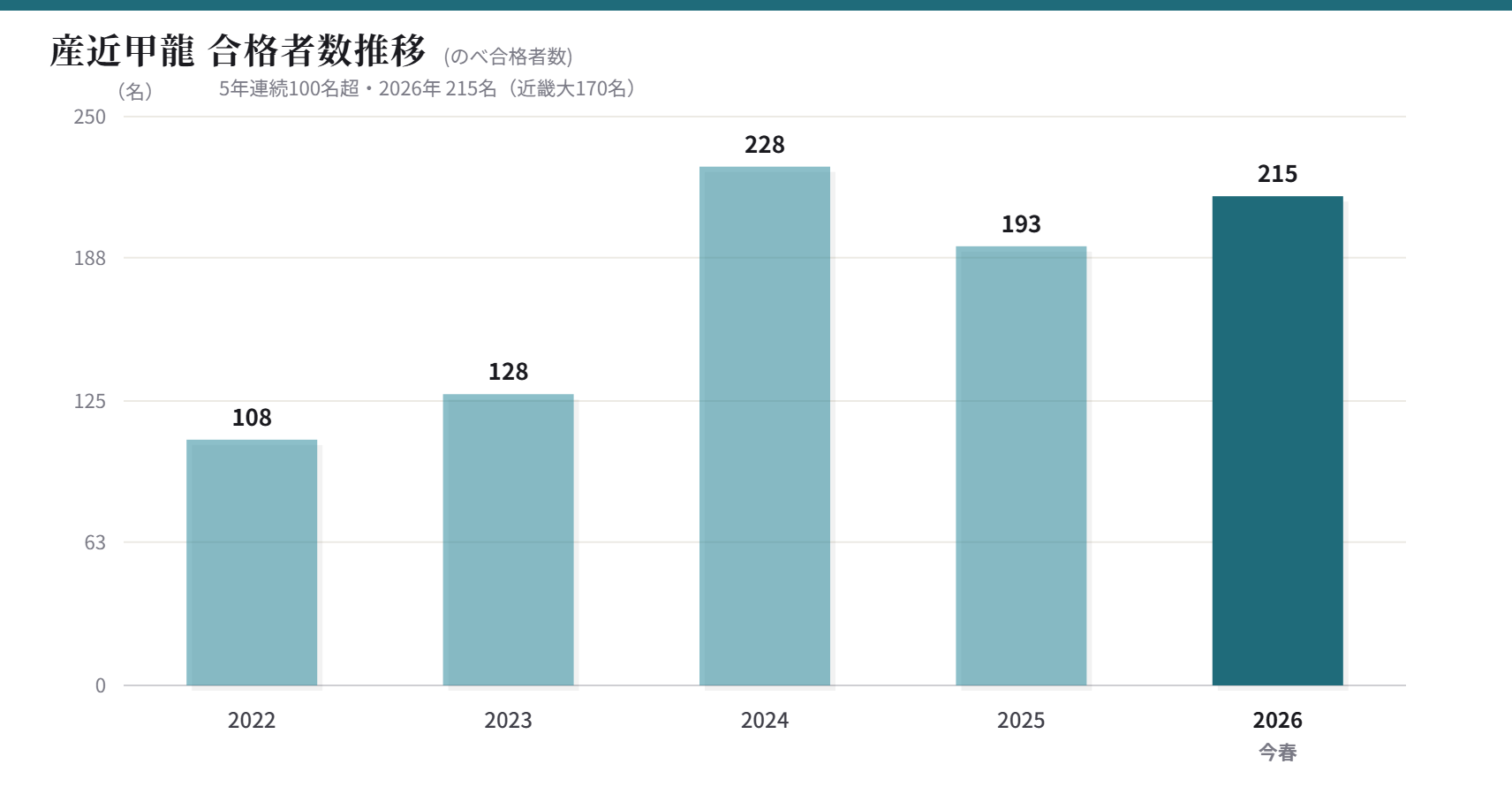 産近甲龍は215名(現役211名)と昨年から1割増加と健闘しました。特に近畿大は昨年とほぼ同数の170名と、3つのコースからここ数年安定して多数の合格が出ています。