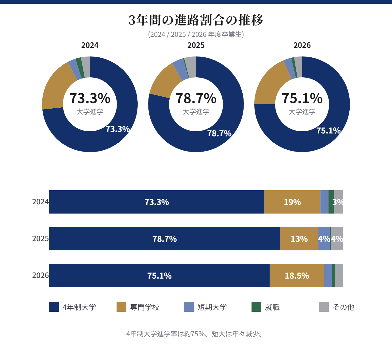今春卒業の78期生(共学11期生)を中心とする2025年度卒業生も、大学進学の指向性が強く、4年制大学合格率は75%と、今年も高い水準になりました。