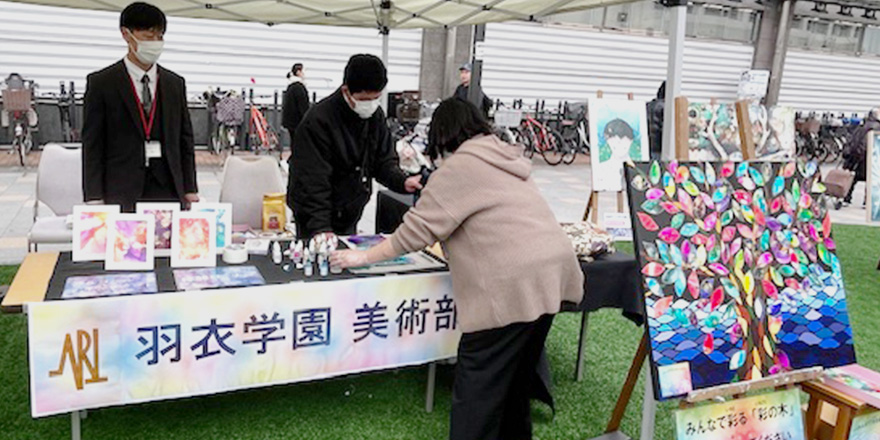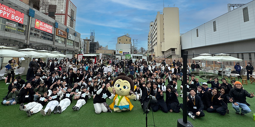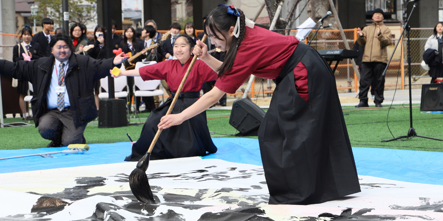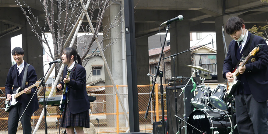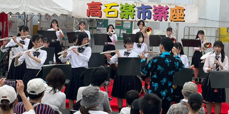 2025年、高石駅前広場の活用推進のプロジェクトの一環で、羽衣学園と高石高校・高石市がコラボして、「高校生とフェスティバル」を開催。フォークソング部や吹奏楽部の演奏、書道部のパフォーマンス、文科系クラブのブース出展など、地域のいろいろな方が参加し楽しめるイベントを高校生たちの手で作り上げました。