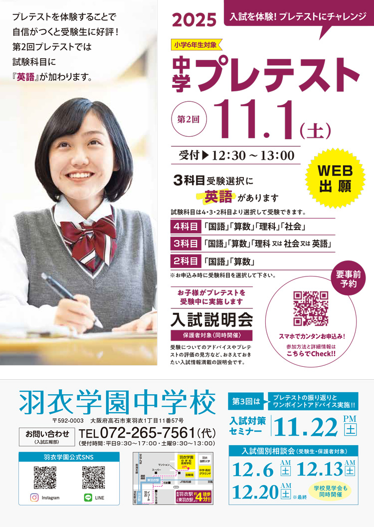 プレテストは羽衣学園中学校の入試模擬テストです。